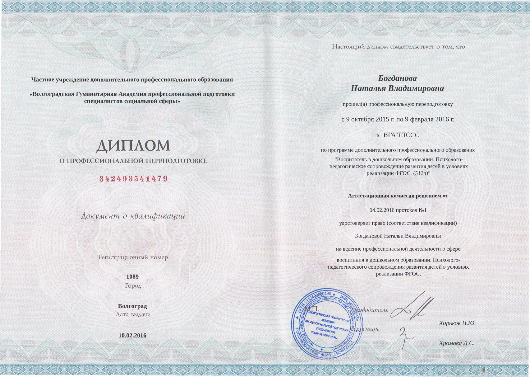 Квалификационная категория по должности заместитель заведующего: высшая (24.03.2021)